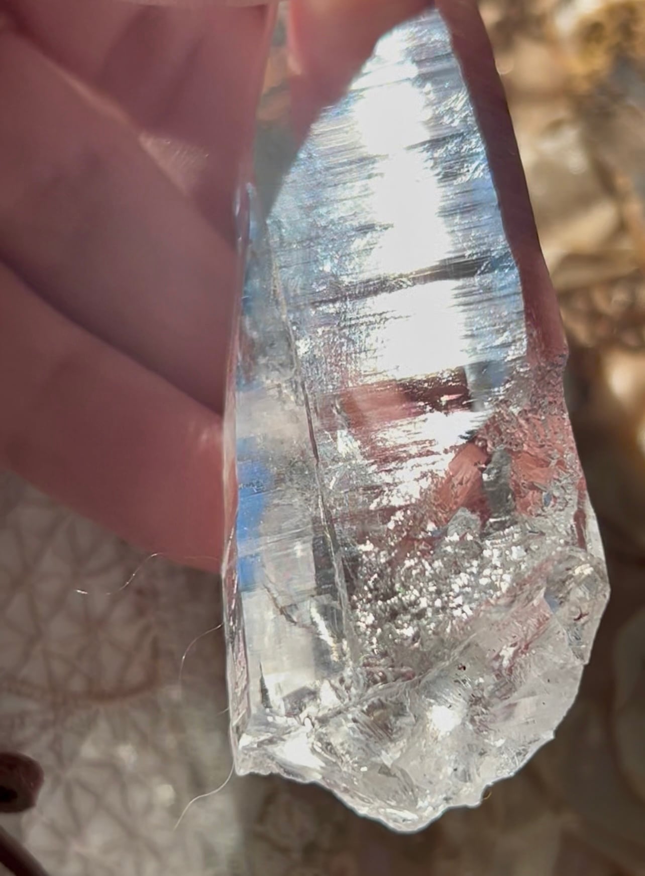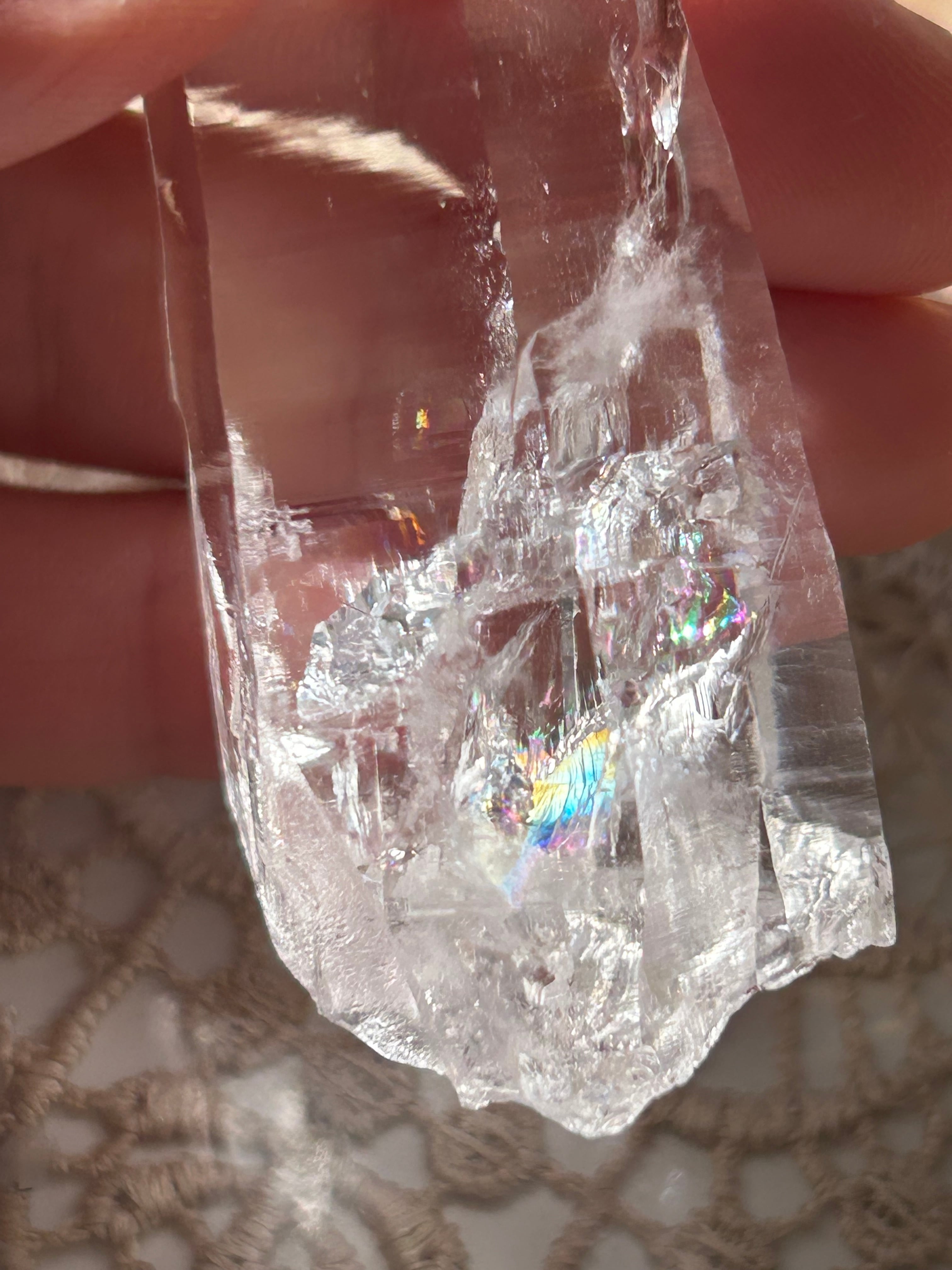 水晶や天然石の特性上、クラックと呼ばれるヒビのような物が入る場合がございますが、品質には問題ございません。虹が出る場合もございますので、お楽しみ下さいませ。