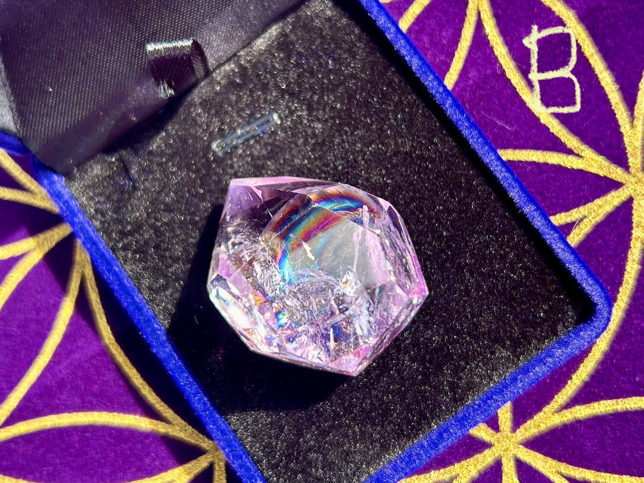 水晶や天然石の特性上、クラックと呼ばれるヒビのような物が入る場合がございますが、品質には問題ございません。虹が出る場合もございますので、お楽しみ下さいませ。